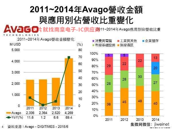 進(jìn)一步分析了應(yīng)用不占收入比例的變化,全球4G LTE在市場(chǎng)的推動(dòng)下,智能手機(jī)單機(jī)配備功率放大器數(shù)倍增,以大陸為首,肆意建設(shè)4臺(tái)G這也使得2011年至2013年期間的基地臺(tái)Avago來自無線通信和基礎(chǔ)設(shè)施等兩大應(yīng)用的收入金額和收入比例逐年上升,其中來自無線通信的收入占2011年的總收入比例Avago授權(quán)代理商2013年,38%增長(zhǎng)到48%,帶動(dòng)Avago收入增長(zhǎng)最重要的動(dòng)能。